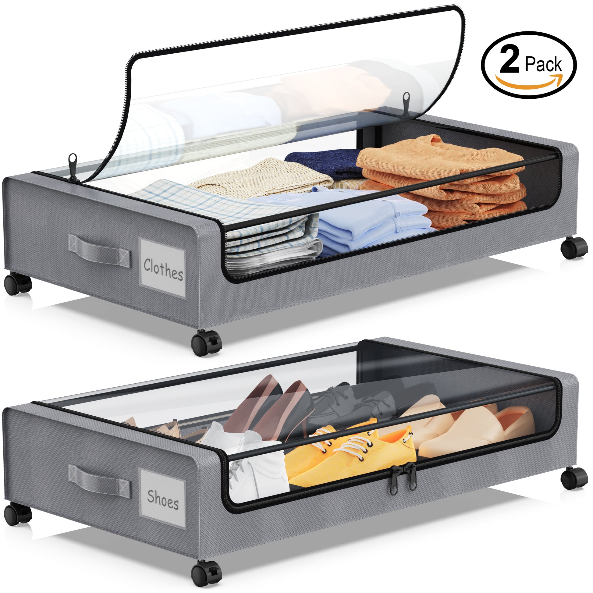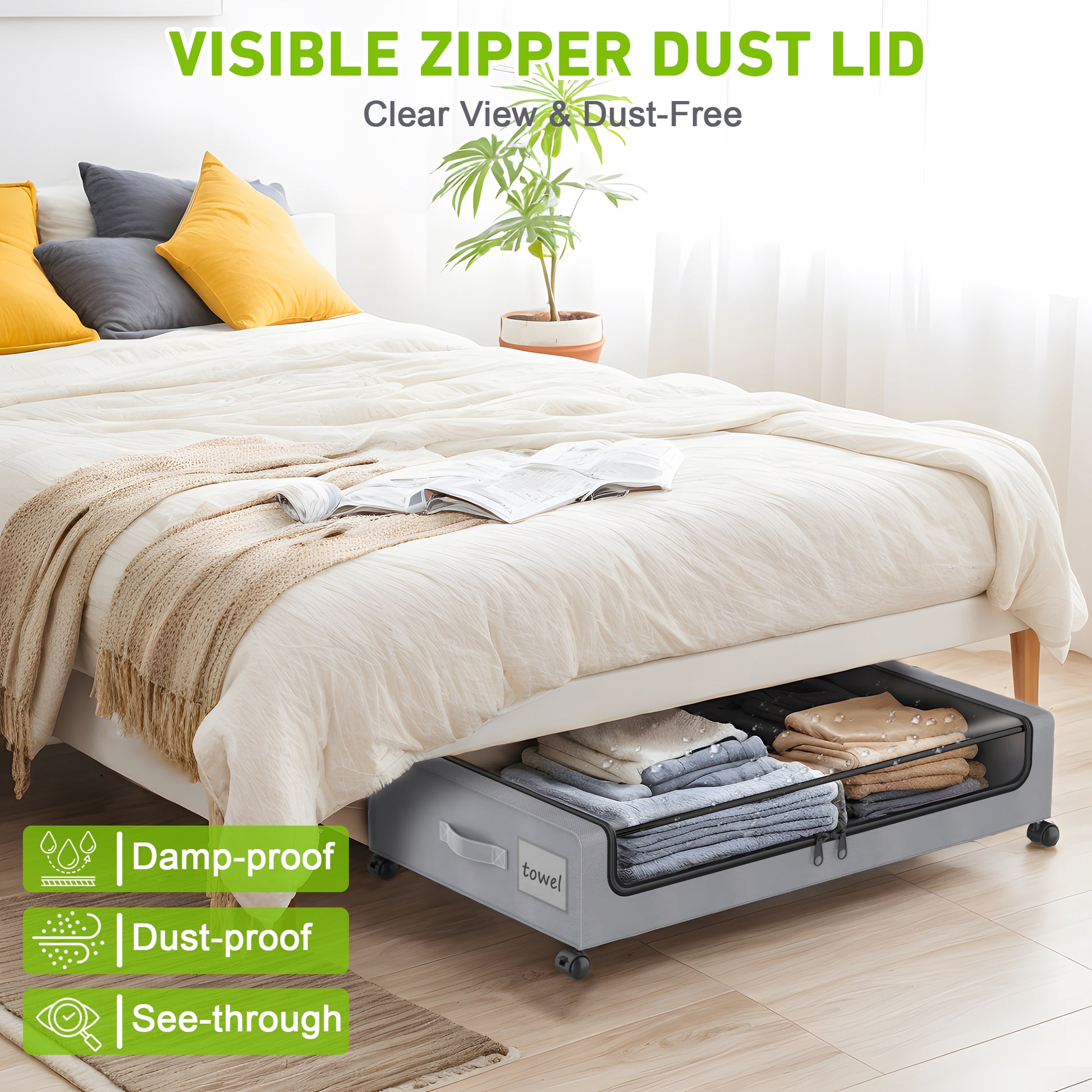 - Clear Lid Design : The transparent top makes it easy to quickly identify what's inside your storage. To totally keep the dust, humidity or dirty out, the under bed rolling storage designed with closed dual zip-up lid and quality non-woven fabric, moreover your kitten and dog can no longer make a mess under your bed. With the all-in-one under bed organizer you needn't worry for finding separately dust bag.